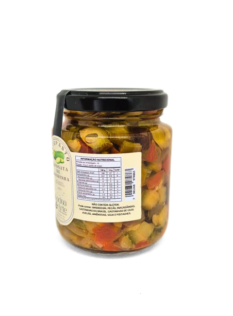 Abobrinha, azeite de oliva, pimentão amarelo, pimentão vermelho, cebola, nozes chilenas light (noz chilenas mariposa), uva passa preta sem sementes (uva passas pretas), vinagre de maçã e sal rosa do himalaia (sal rosa do himalaia e carbonato de potássio).