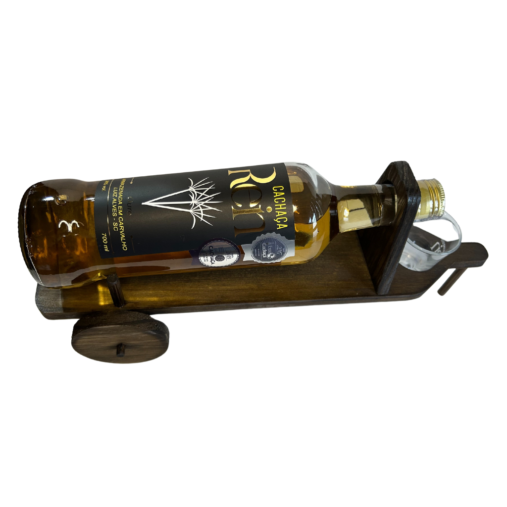 Em uma combinação perfeita entre a tradição e a sofisticação, a Carroça em madeira artesanal, acompanhada por uma garrafa da Rein Cachaça Ouro e um elegante copo de vidro. A Rein Cachaça Ouro que você já conhece: Destilada em alambique de cobre estilo Hand Made, armazenada em barril de carvalho pelo período mínimo de 06 meses, coloração dourada, aromas característicos de baunilha, coco e amêndoas, sabor suave e buquê aromático equilibrado. Ideal para consumir pura, ou ainda em drinks. Conquistou medalha de ouro na Expocachaça 2017 e 2019.