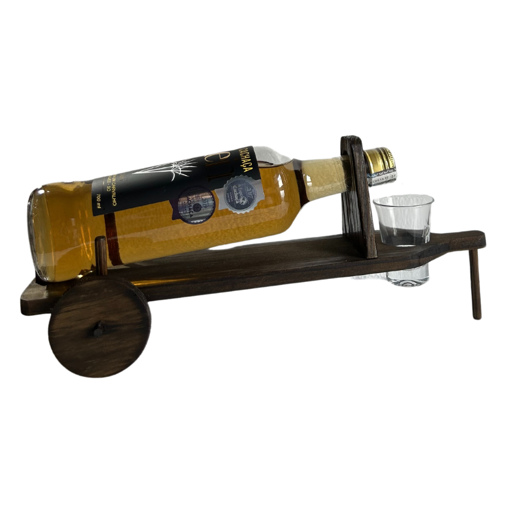 Especificação: Carroça em Madeira com Rein Cachaça Ouro e Copo