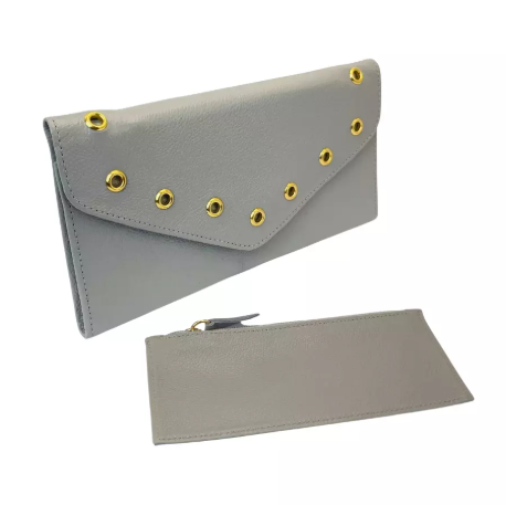 Carteira Feminina Slim + Porta Estojo Couro Legítimo Zíper – Cinza