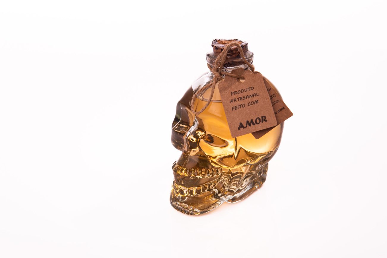 Caveira Contém 180 ml de Cachaça Ouro Armazenada em Barril de Carvalho Francês.