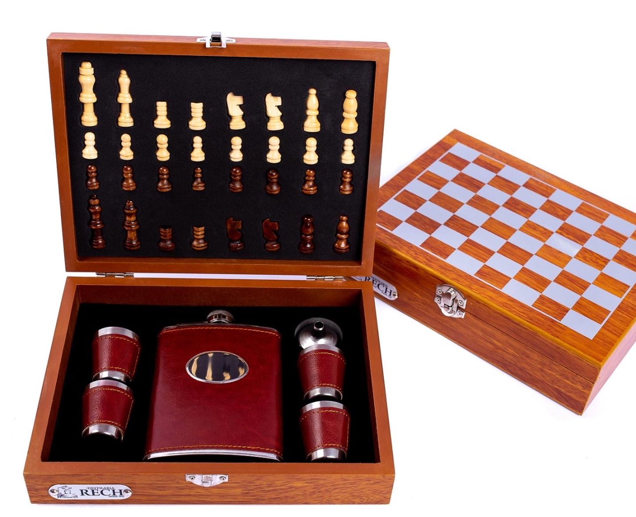 Kit Xadrez contém 1 Cantil + 4 Copos, Acabamento em Couro