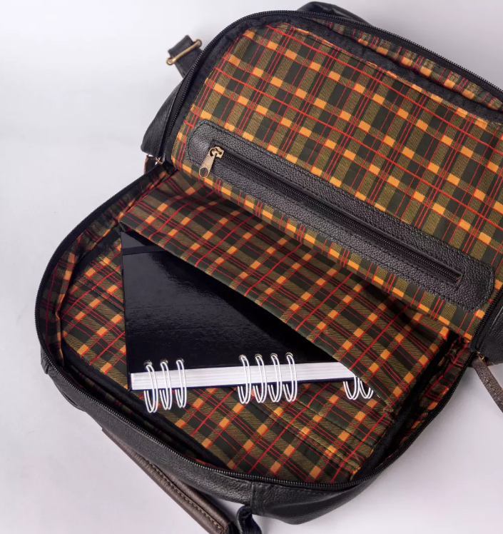 O interior é revestido com forro xadrez moderno, que agrega charme e sofisticação ao produto. As ferragens de alta qualidade, os puxadores de zíper em couro e o acabamento cuidadoso reforçam a durabilidade e o padrão elevado da mochila.