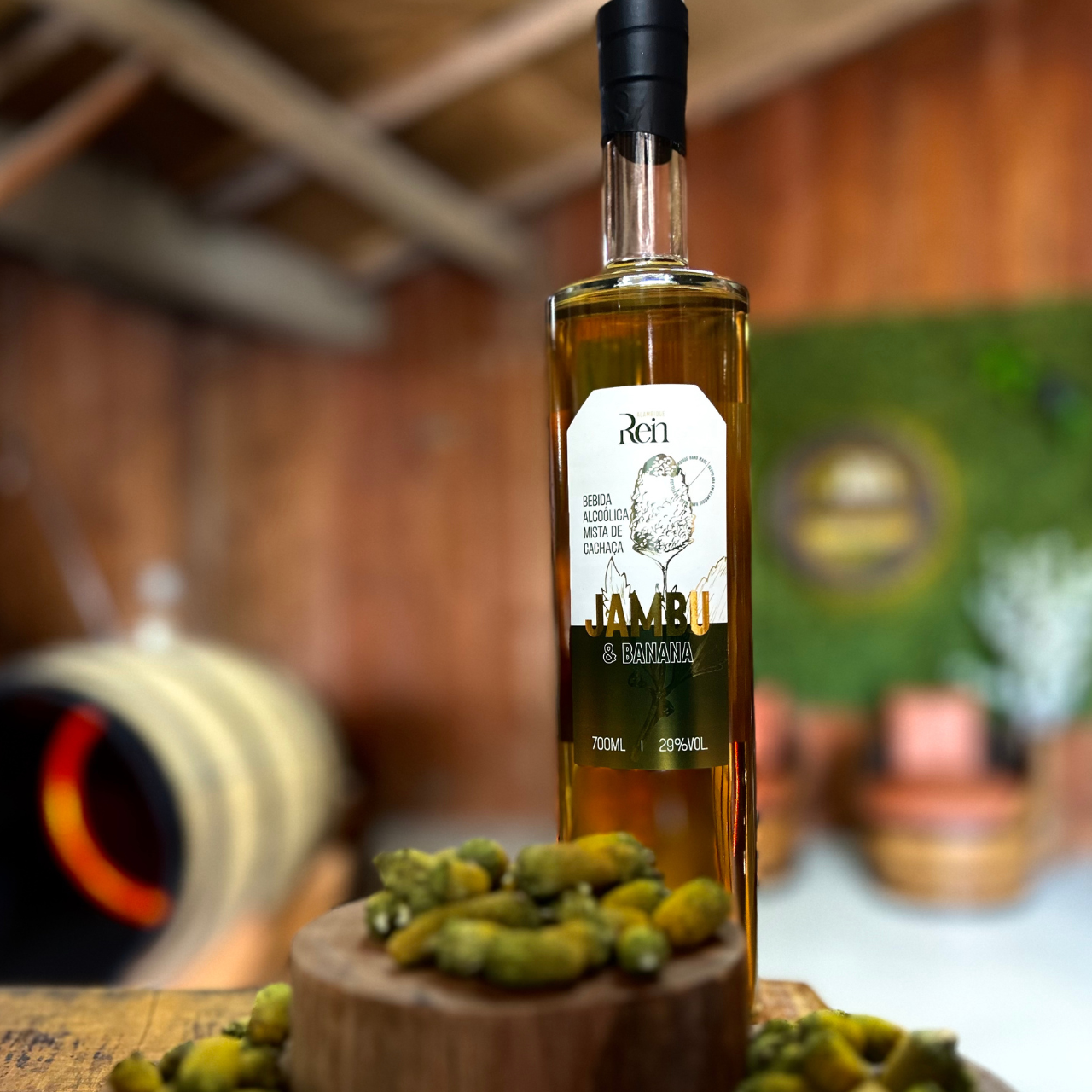 Um dos efeitos mais interessantes da erva é a capacidade de anestesiar os lábios e língua, graças a substância espilantol presente, tornando a experiência de desgustar a Rein Cachaça com Jambu e Banana algo único e especial.
